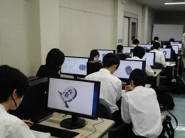 デジタル技術の一つである3次元CADを用いた授業です。 コンピュータの中で部品を作成したり、組み立てたりします。 また、強度計算や機構解析、熱流体解析などのシミュレーションについても勉強していきます。